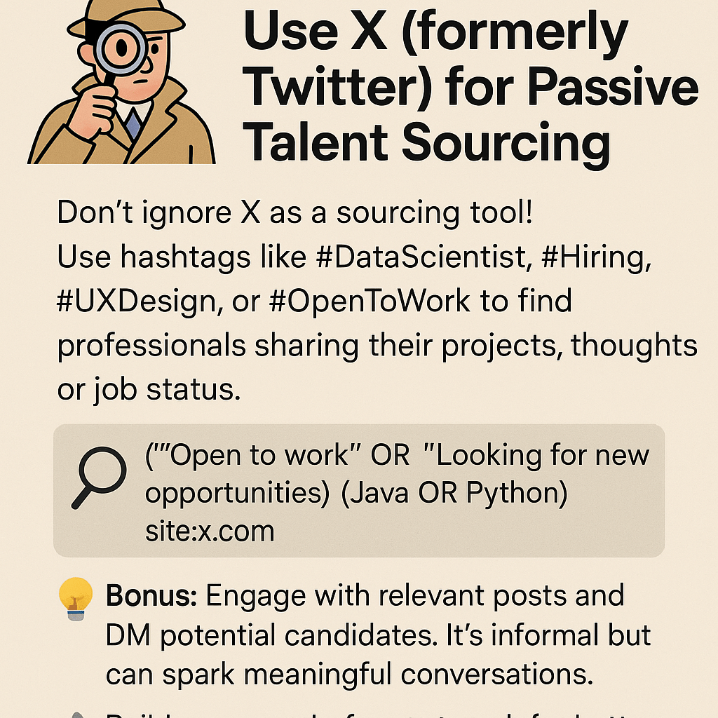 🕵️‍♂️ Day 11 – Use X (formerly Twitter) for Passive Talent Sourcing Don’t ignore X as a sourcing tool! Use hashtags like #DataScientist, #Hiring, #UXDesign, or #OpenToWork to find professionals sharing their projects, thoughts, or job status.