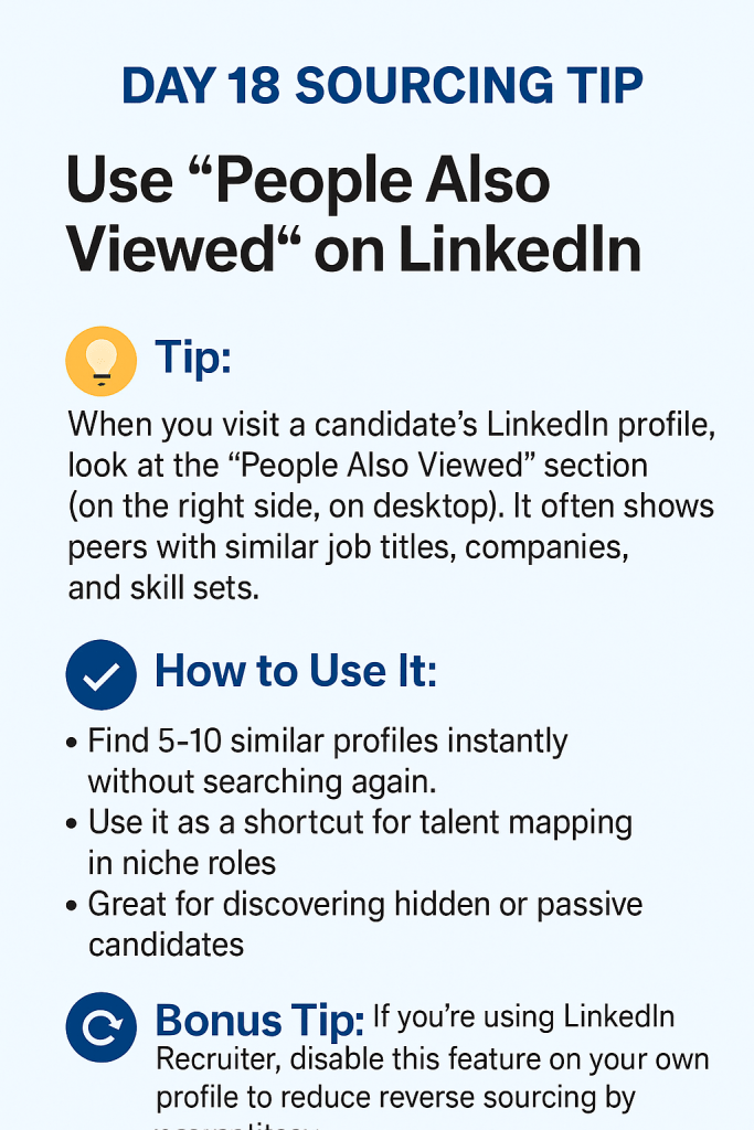 đź§ Day 18 Sourcing Tip🎯 Use “People Also Viewed” on LinkedIn đź‘€ When viewing a candidate’s profile, scroll to the “People Also Viewed” section.It’s a goldmine of similar professionals with: […]