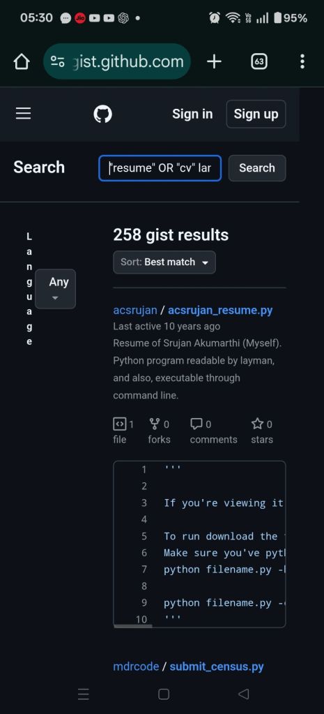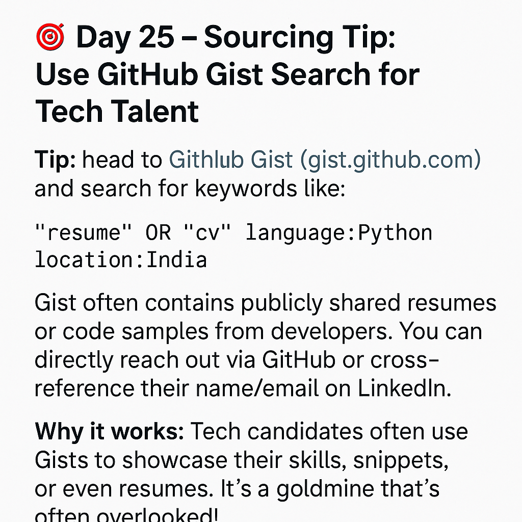 ๐ฏ Day 25 โ Sourcing Tip: Use GitHub Gist Search for Tech Talent Tip:Head to GitHub Gist ( https://gist.github.com/starred) and search for keywords like: “resume” OR “cv” language:Python location:India Gist […]