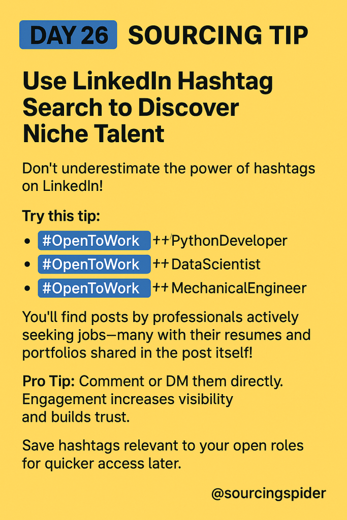 🎯 Day 26 – Use LinkedIn Hashtag Search to Discover Niche Talent Don’t underestimate the power of hashtags on LinkedIn! 🔍 Try this tip:Search using #OpenToWork + skill hashtags like👉 […]