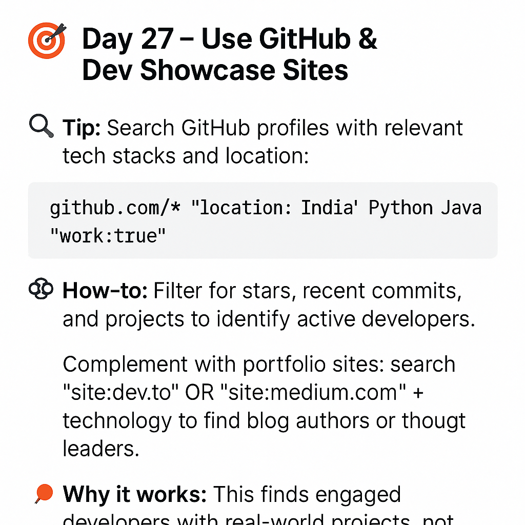 đź’»GitHub profiles are public: Developers often list their location in profiles, enabling targeted searches like: location: India Python Java work:true You can assess activity metrics—stars, commits, project contributions—to find active […]