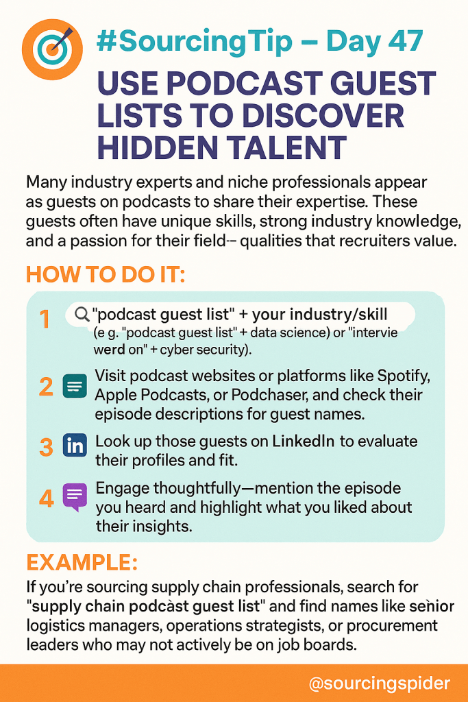 🎯 #SourcingTip – Day 47 Use Podcast Guest Lists to Discover Hidden Talent Many industry experts and niche professionals appear as guests on podcasts to share their expertise. These guests often have unique skills, strong industry knowledge, and a passion for their field—qualities that recruiters value.