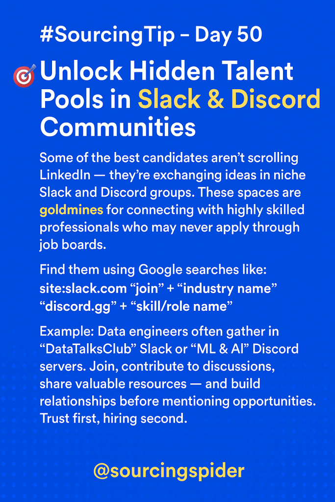 💻 #SourcingTip – Day 50 Unlock Hidden Talent Pools in Slack & Discord Communities