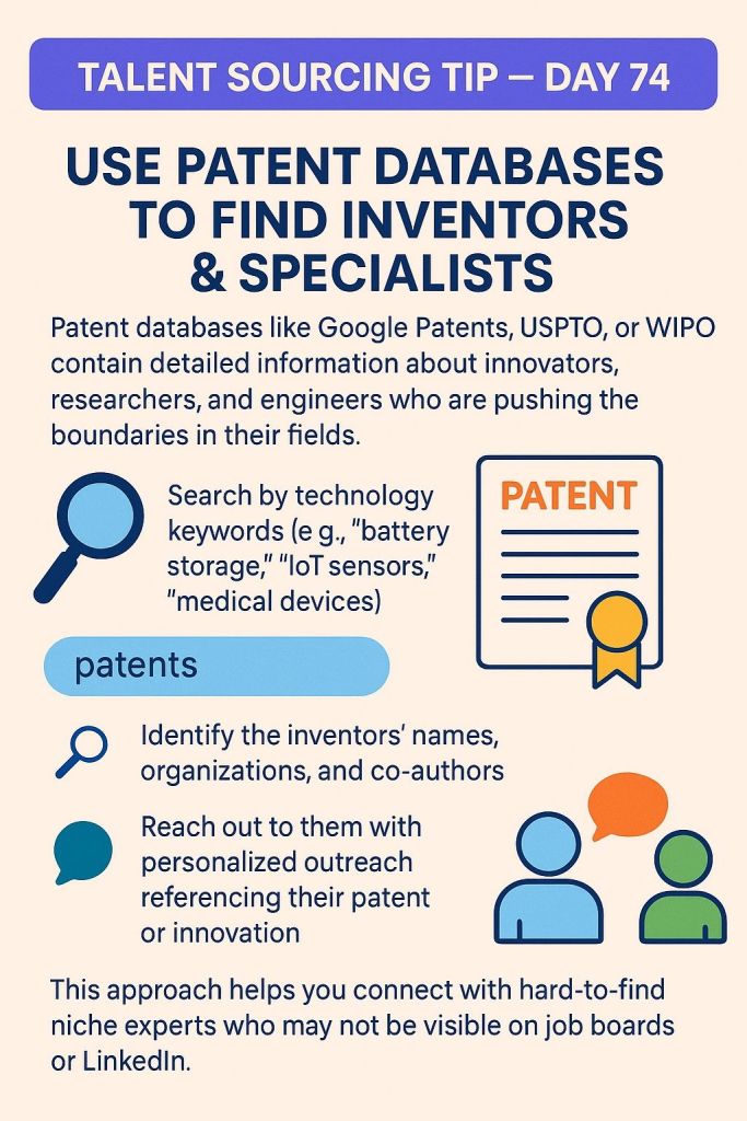 Talent Sourcing Tip – Day 74 Use Patent Databases to Find Inventors & SpecialistsPatent databases like Google Patents, USPTO, or WIPO contain detailed information about innovators, researchers, and engineers who […]