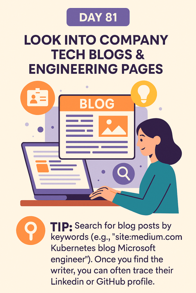🔑 Tip: Search for blog posts by keywords (e.g., “site:medium.com Kubernetes blog Microsoft engineer”). Once you find the writer, you can often trace their LinkedIn or GitHub profile. Reaching out with a personalized note about their blog work builds instant credibility.