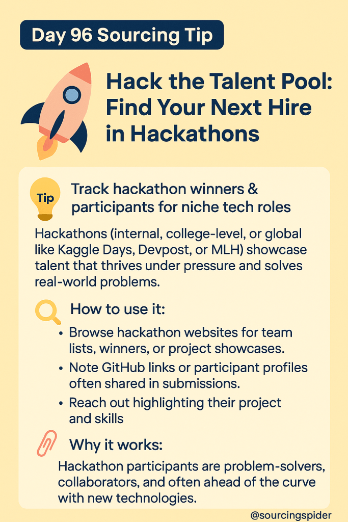 💡 Tip: Track hackathon winners & participants for niche tech roles. Hackathons (internal, college-level, or global like Kaggle Days, Devpost, or MLH) showcase talent that thrives under pressure and solves real-world problems.