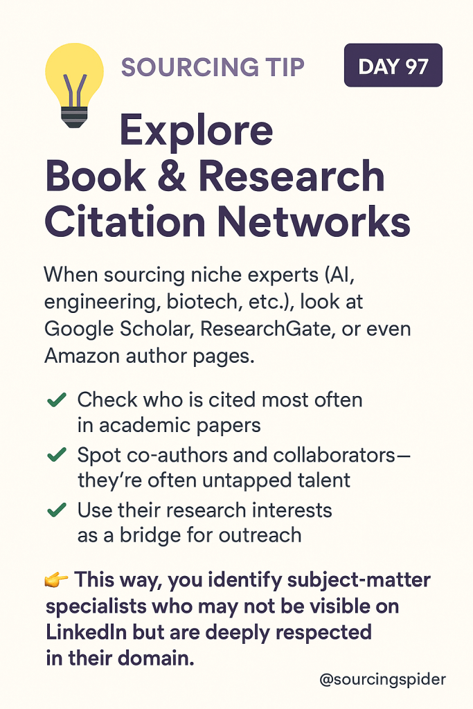 💡 Day 97 Sourcing Tip: Explore Book & Research Citation Networks When sourcing niche experts (AI, engineering, biotech, etc.), look at Google Scholar, ResearchGate, or even Amazon author pages.